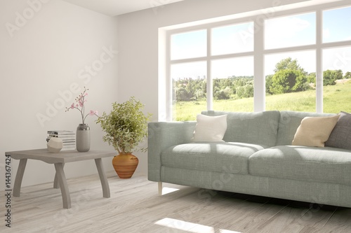 White room with sofa and green landscape in window. Scandinavian interior design. 3D illustration