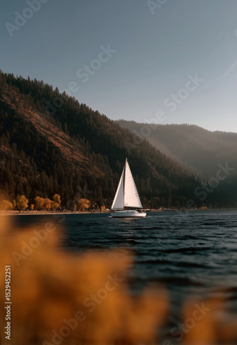 White sailboat gliding on calm lake with forested mountain backdrop at sunset, tranquil outdoor adventure scene