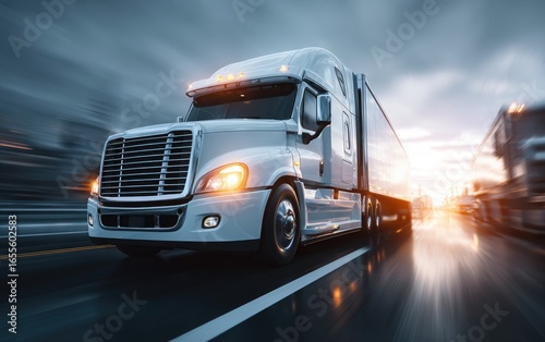 truck, semi, transport, highway, road, speed, motion, blur, dawn, sunrise, cargo, freight, delivery, commercial, vehicle, transportation, logistic, industry, business, express, shipping, heavy, load, trailer, modern, fast, efficient, powerful, economy, future, urban, city, moving, speedy, technology, driving, commerce