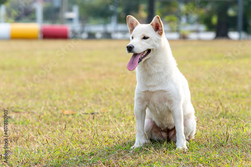 White Shiba Inu or Hokkaido Inu. White dog standing in the playground. Shiba inu dog the yard. Japanese dog.