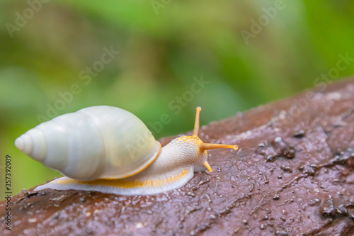 White snail crawling in tropical forest on artificial wood by concrete