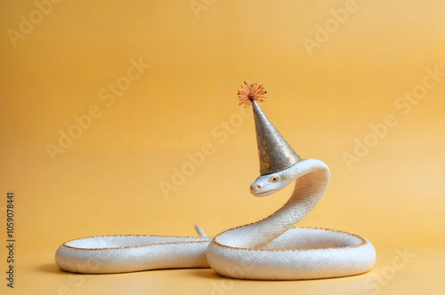 white, snake, party, hat, yellow, reptile, celebration, festive, animal, costume, cheerful, playful, fun, serpentine, fashion, quirky, unique, nature, wildlife, birthday, decoration, headwear, fancy, pet, mysterious, elegant, exotic, creative, unusual, striking, whimsy, style, background, posing, joyful, theme, pattern, vibrant, colourful, cool, scene, art, eye-catching, imaginative, surreal, fun-loving, amusing, charming