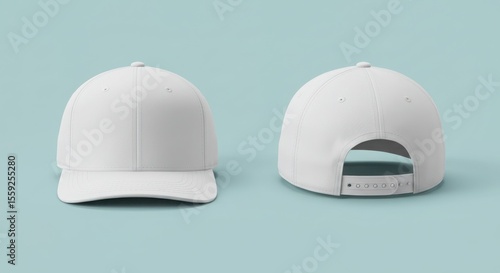 White Snapback Hat Mockup Showing Front and Back Views Side-by-Side, Baseball Cap Isolated on Soft Cyan Background with Realistic Texture and Studio Lighting