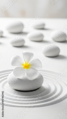 White stone on sand with ripples and jasmine flowers. Zen garden concept for relaxation, spa, and harmony. Minimalist background for self-care. Cloud Dancer Color of the Year 2026