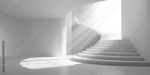 white, interior, sunlit, staircase, curved, light, empty, space, modern, architecture, design, geometric, minimalist, clean, bright, sunlight, shadow, room, wall, floor, perspective, empty space, simple, studio, monochromatic, abstract, interior design, architectural, contemporary