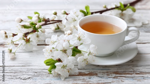 white, tea, cup, delicate, blossom, tree branch, wooden, table, drink, flower, breakfast, hot, beverage, saucer, green, food, black, healthy, teacup, liquid, herbal, isolated, mug, leaf, hot drink, brown, object, closeup, refreshment, china