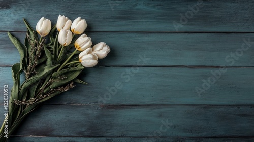 White Tulips Bouquet on Rustic Teal Wooden Background Spring Flowers Floral Arrangement