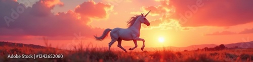 White unicorn sprints, vibrant sunset backdrop, dreamy, animal