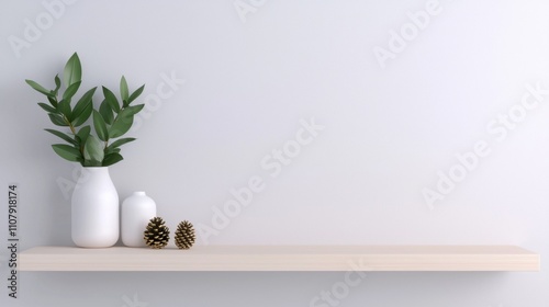 white, wall, wooden, shelf, attached, vase, green, leaf, placed, left, pine, cone, background, plain, aesthetic, minimalistic, minimalism