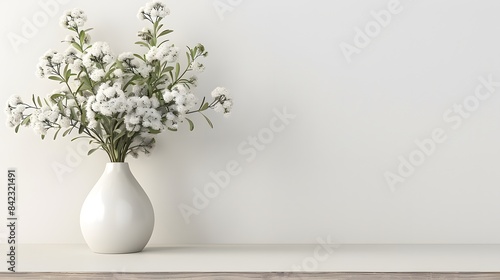 White wall with white flower vase on a table, in a minimalistic style, with a simple background, copy space for text or logo, with a clean and elegant design.