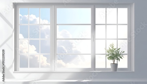 window, sky, cloud, white, bright, sunlight, light, room, plant, potted, green, clean, fresh, modern, simple, minimalist, interior, sunny, day, view, outside, air, perspective, frame, line, grid, detail, texture, structure, shade, shadow, sill, horizontal, natural, peaceful, calm, serene, clear, blue, daylight, quiet, tranquil, composition, element, design, aesthetic