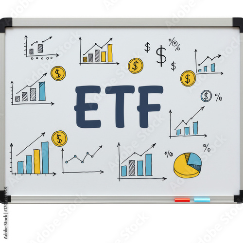 Whiteboard displaying etf with various financial charts and symbols isolated on transparent background