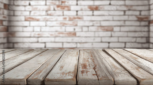Whitewashed wooden table with rustic texture in front of whitewashed brick wall background, creating cozy and vintage atmosphere for interior design or product display