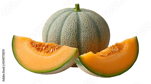 Whole cantaloupe melon with two slices showing orange flesh and seeds isolated on transparent background