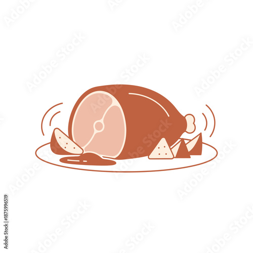 Whole Ham Roast with Slices on a Plate, Minimalist Flat Illustration