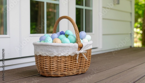 basket, wicker, pastel, speckled, easter egg, spring, fresh, porch, morning, sunshine, lifestyle, tradition