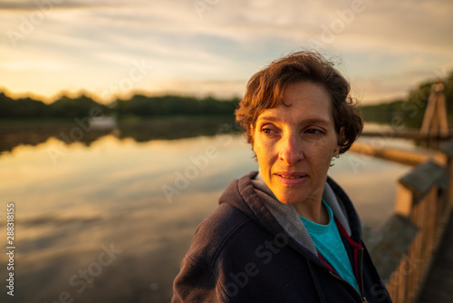 Wide angle shot of an older woman at sunrise
