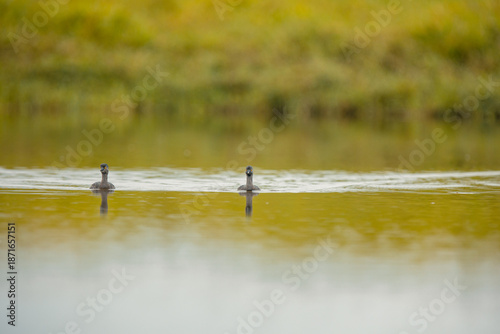 bird, nature, water, wildlife, lake, grebe, swimming, pair, 2, couple, wetland, duck pond, green, calm, water bird, animal, wild, aquatic, scenic, peaceful, serene, environment, natural, landscape, habitat, avian, ornithology, fauna, distance, surface, ripple, arousing, grass, background, beauty, wilderness