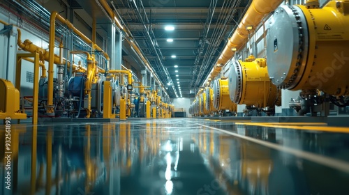 shot, extensive, maintenance, tunnel, showing, multiple, steel, water, pump, running, ceiling, surrounded, complex, piping, system, equipment, illuminated, harsh, fluorescent, light, reflecting, off, polished, metal, surface