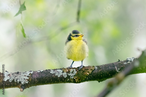 Wild bird in natural habitat. Funny cute nestling sitting on the branches of a tree with young green leaves.