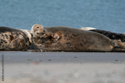 Wild Grey lazy seal colony on the beach at Dune, Germany. Group with various shapes and sizes of gray seal