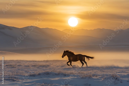 Wild Horse Galloping Through Snowy Landscape at Sunset.