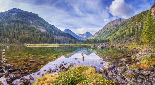 Wild mountain lake, summer landscape, reflection in the water and stones at the bottom