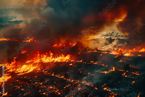 Wildfires consume vast landscapes, fueled by dry conditions and strong winds, leaving trails of destruction in their wake.