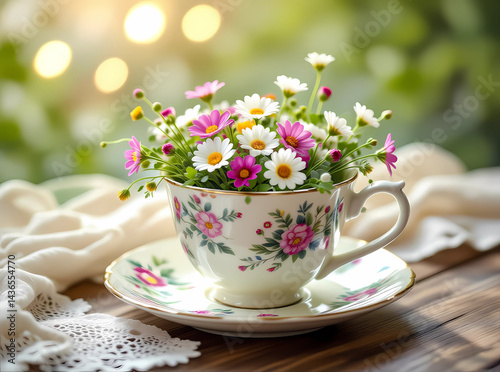 wildflower, teacup, mother's day, gift, table, flower, floral, bouquet, spring, summer, sunlight, window light, cosy, still life, indoor, home, decoration, decorative, beautiful, pretty, feminine, delicate, pastel, soft, charming, elegant, present, love, appreciation, gratitude, cheerful, happy, celebration, holiday, festive, bright, colourful, daisy, vintage, rustic, morning, breakfast