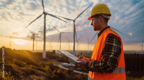 wind energy, engineer, wind farm, renewable energy, sunset, turbine, hard hat, clipboard, inspection, sustainable, power generation, landscape, ecological, industry, environment, technology, outdoors, planning, infrastructure, green energy, engineering, professional, nature, worksite, efficiency, power, energy production, innovation, utility, horizon, silhouette, grid, environmental, technician, maintenance