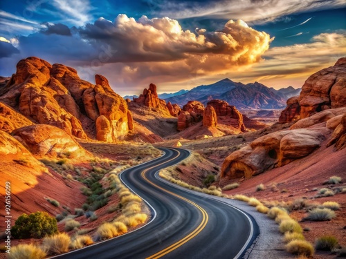 Winding asphalt road stretches through a majestic, fiery red rocky landscape surrounded by ancient petroglyphs and towering sandstone formations in a Nevada desert.