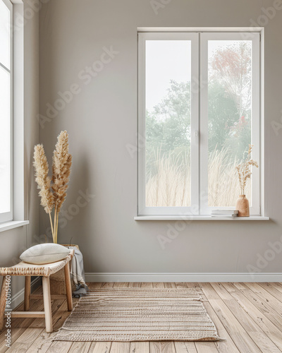 Window in an empty room of an apartment lighting the scene. Interior design composition with minimal furniture and copy space