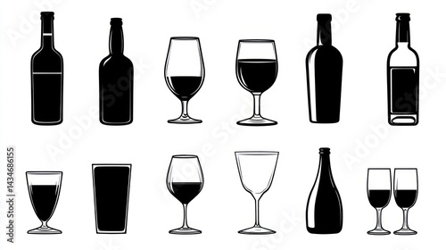 wine, glasses, bottle, liqueur, drink, beverage, alcohol, bar, eatery, illustration, graphic, design, silhouette, black, white, vector, image, set, collection, cocktail, beer, champaign, wine glass, red, spirit, graphic design, pub, cafes, epicure, celebration, party, event, barkeeper