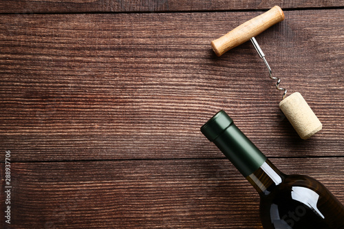 Wine bottle with cork and corkscrew on brown wooden table