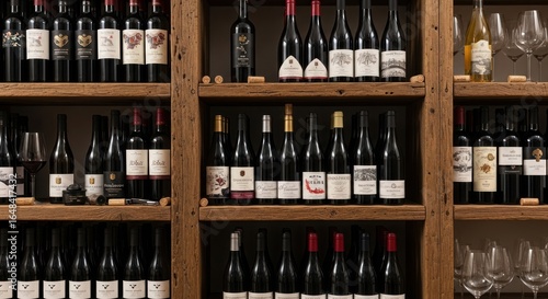 wine, bottle, shelf, wooden, rustic, alcohol, drink, beverage, cellar, collection, display, vintage, label, glasses, cork, winery, vinery, epicure, luxury, tasting, arrangement, stack, row, dark, red, white, variety, assortment, celebration, party, event, eatery, bar, sommelier, connoisseur, aged, oak, storage, tradition, culture, still life, indoor, closeup, nobody, elegant, premium, quality, product, merchandise