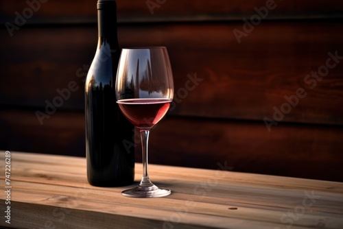 Wine glass and bottle placed on a wooden table in a restaurant, drinks and relaxation ​