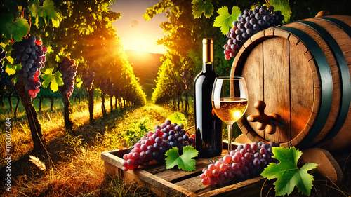 Wine Glasses And Bottle With Grapes And Barrel In Vineyard At Sunset