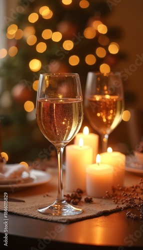 Wine glasses and candles set on table for romantic dinner. Soft warm light from bokeh Christmas tree background. Cozy festive celebration atmosphere.