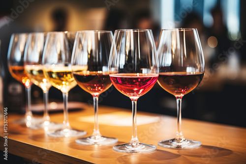 Wine Selection and Wine Tasting: wine glasses for wine tasting with a variety of wines, close-up