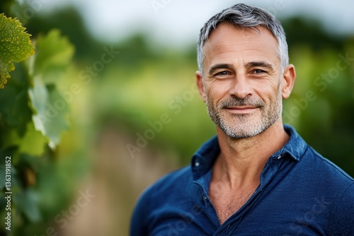 Wine tasting event sommelier luxury Man smiling in vineyard with grapevines in the background.
