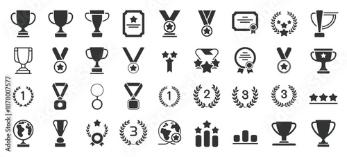 Winning vector icons, including trophies, medals, ribbons, stars, and victory symbols, vector illustrations perfect for achievement, competition, sports, and celebration design projects.