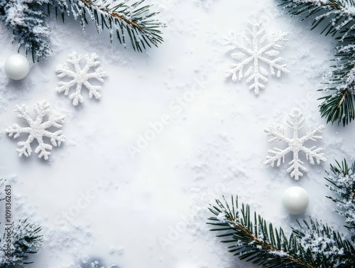Winter background with snowflakes and pine branches creating a festive atmosphere.
