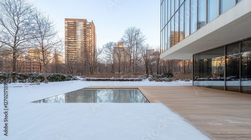 Winter cityscape, modern architecture, snow-covered courtyard, urban park, tranquil scene, possible use for architectural photography