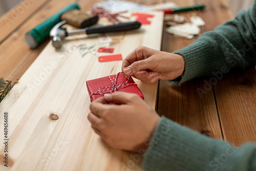 winter holidays and hobby concept - close up of woman with box and rope packing christmas gift or making advent calendar at home
