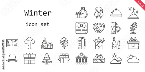 winter icon set. line icon style. winter related icons such as gift, pine tree, scarf, christmas tree, tree, dinner, cloudy, mountain, walrus, postcard, champagne, letterbox, hat, cabins, gifts,