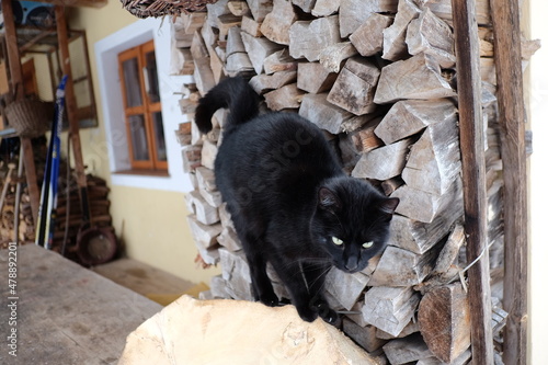 Winter in the mountains. Black cat
