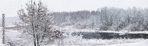 Winter landscape, Christmas and New Year. Forest lake wrapped in white snow