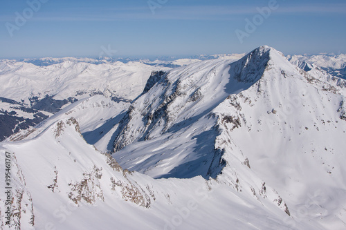 Winter landscape in the Alps. Mayrhofen sports region in the Zillertal. Ski slopes in the background of mountains