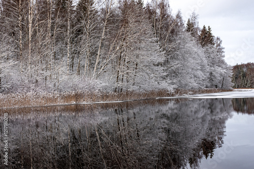 winter landscape with calm lake, white trees, reeds, reflections of the still lake, enchanting peace in nature, Vaidava Lake, Latvia