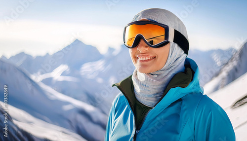 Winter portrait of a woman wearing a hijab and ski goggles smiling in a snowy mountain landscape under a clear blue sky